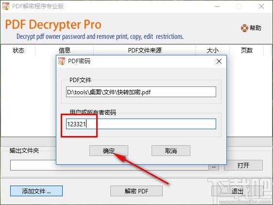 3.将PDF文件添加进来之后就需要对PDF文件的密码进行输入,在用户或所有者密码这个位置输入我们加密文件时设置的密码,然后点击确定按钮。