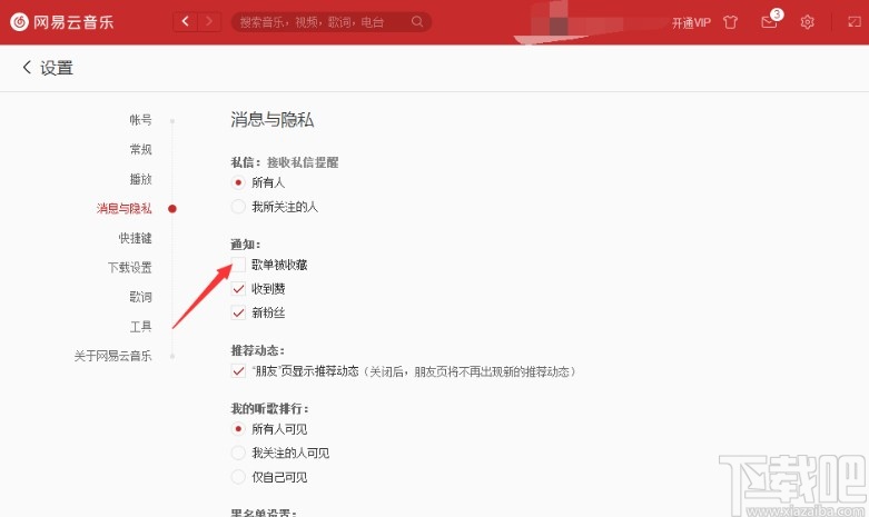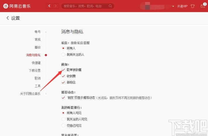 3.切换到消息与隐私这个选项之后,我们在右边的通知模块就可以看到歌单被收藏这个选项了,此时是勾选状态。