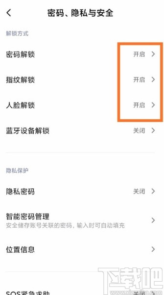 2.点击进入到这个密码、隐私与安全设置界面之后,我们找到密码解锁选项之后点击进入到其中。