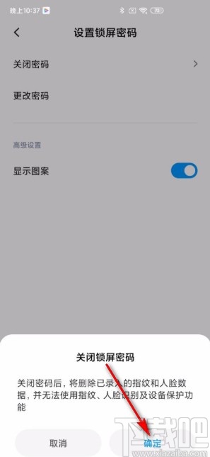 4.点击关闭密码选项之后,下一步会出现一个是否确认关闭密码的界面,确认关闭的话点击确定按钮就可以关闭锁屏密码了。