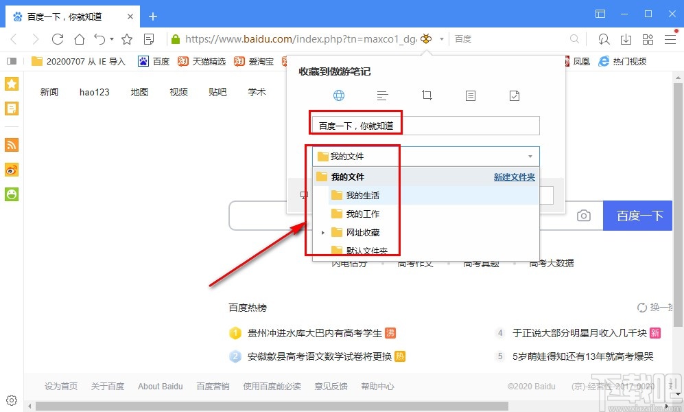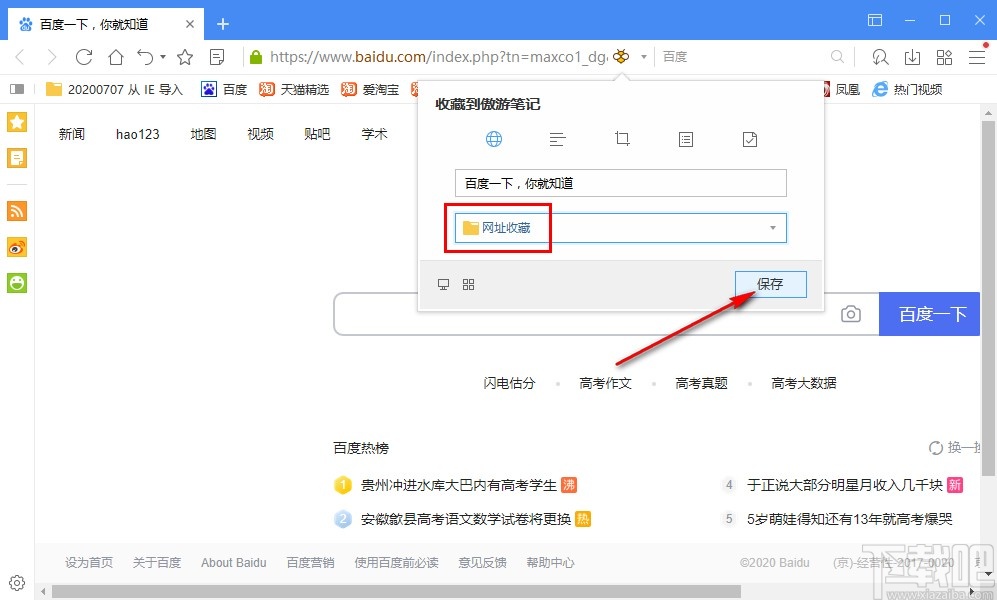 2.点击添加到收藏之后,会出现一个收藏到傲游笔记的界面,我们可以设置网页收藏的名称和存放的文件夹。