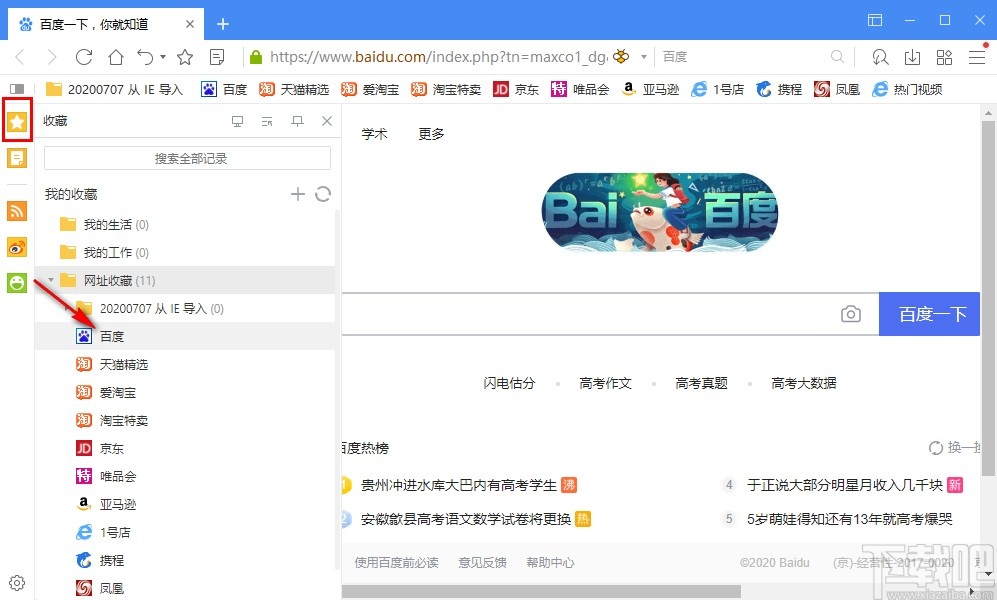 4.收藏完成之后,我们点击浏览器左边的星号按钮,如下图中所示,点击之后在出现的收藏夹里面就可以看到自己刚刚收藏的网页了。