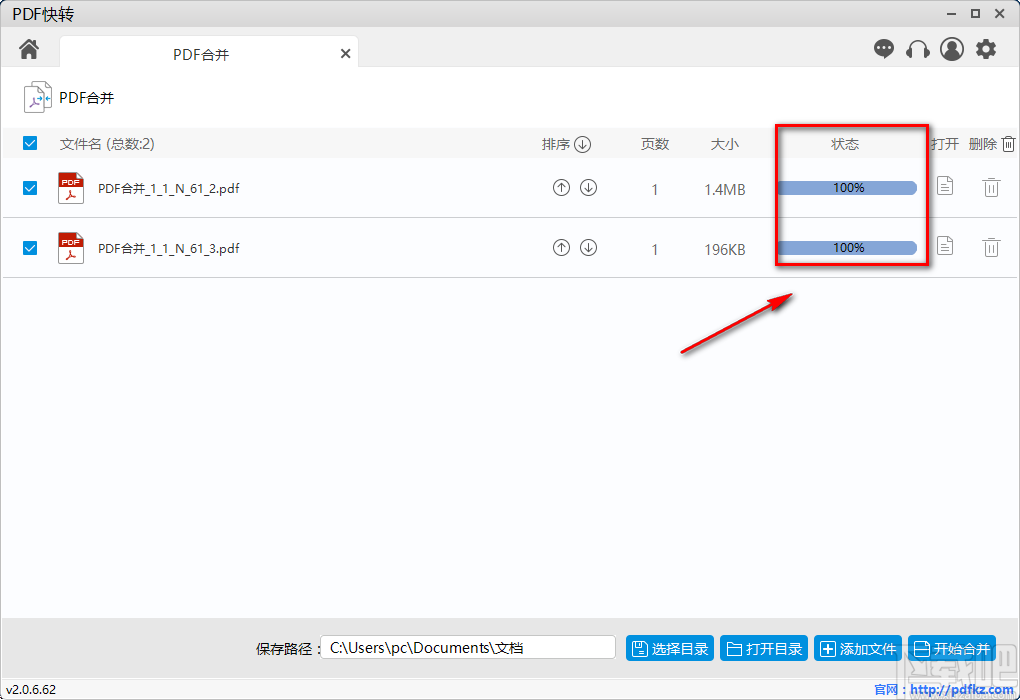 7.合并PDF文件的速度非常快,合并任务完成后,我们在界面上的文件列表中可以查看到合并的状态是100%。