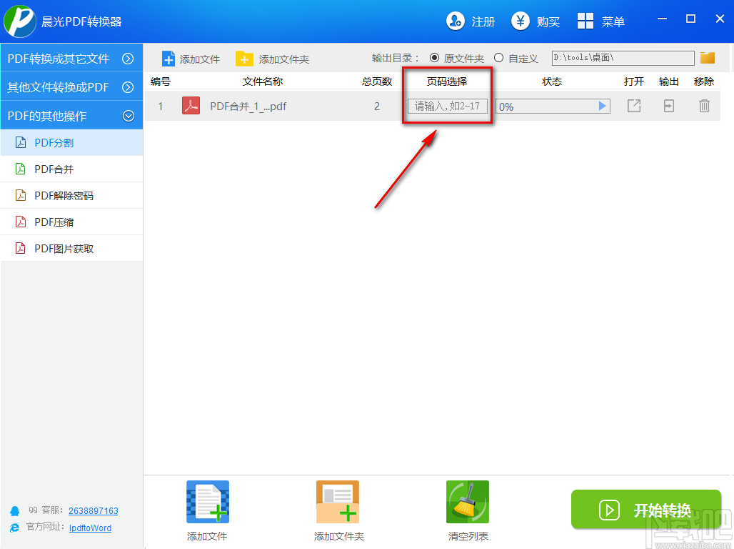 5.接着在界面上的文件列表中找到“页码选择”选项,点击其下方的文本框,并根据自己的需要在文本框中输入需要分割的页面范围。