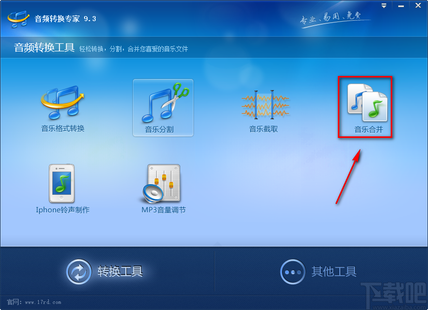 1.首先打开软件,在软件界面的右上方找到“音乐合并”选项,点击该选项进入到音乐合并页面。