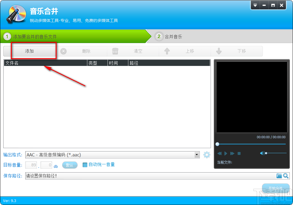 2.在音乐合并页面中,我们在页面左上角找到“添加”按钮,点击该按钮就可以进入到文件添加页面。