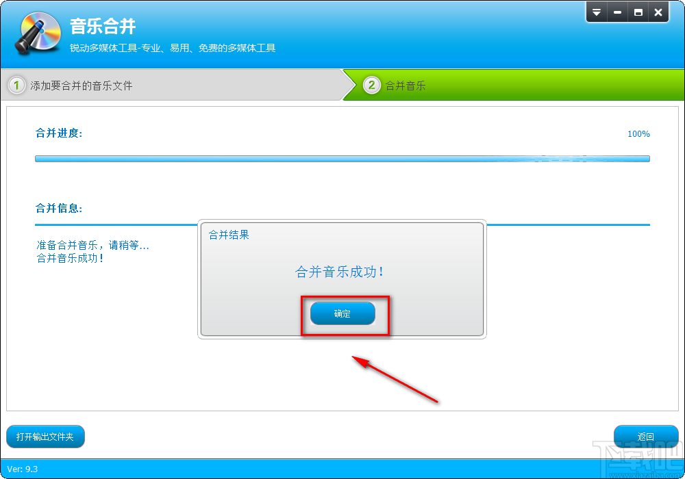 10.音频合并的速度非常快,大约几秒钟的时间就可以完成;音频合并完成后,界面上会弹出一个合并音乐成功的提示框,我们点击框中的“确定”按钮即可完成全部的操作步骤。