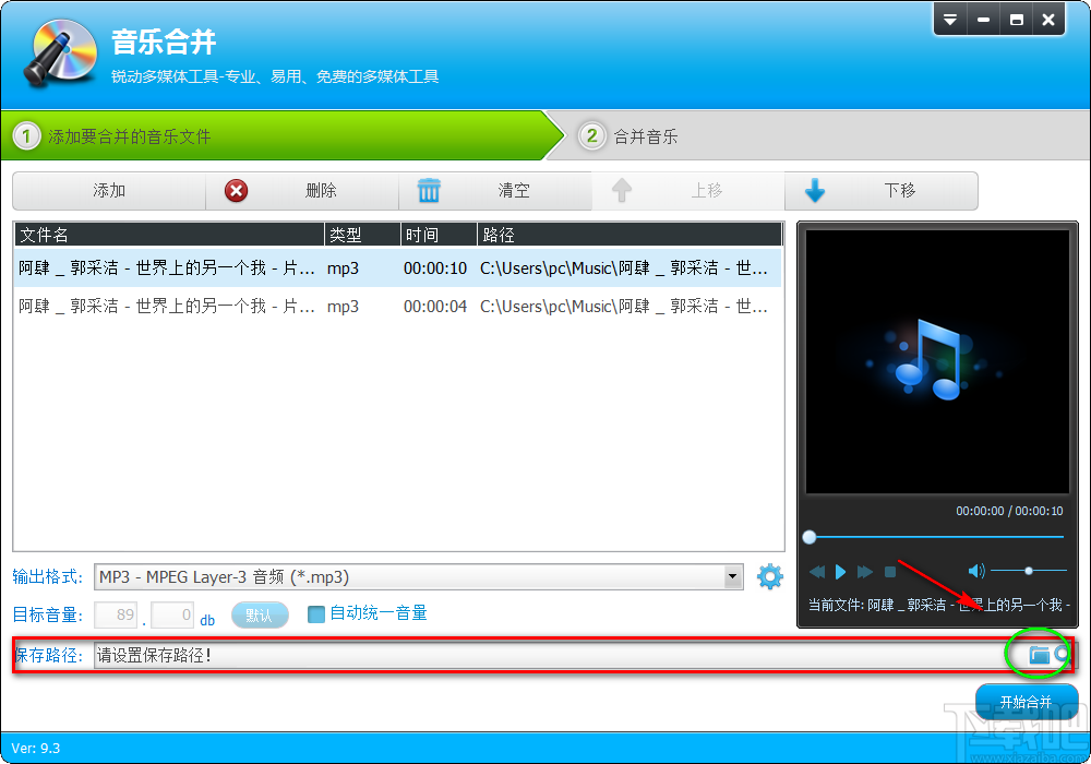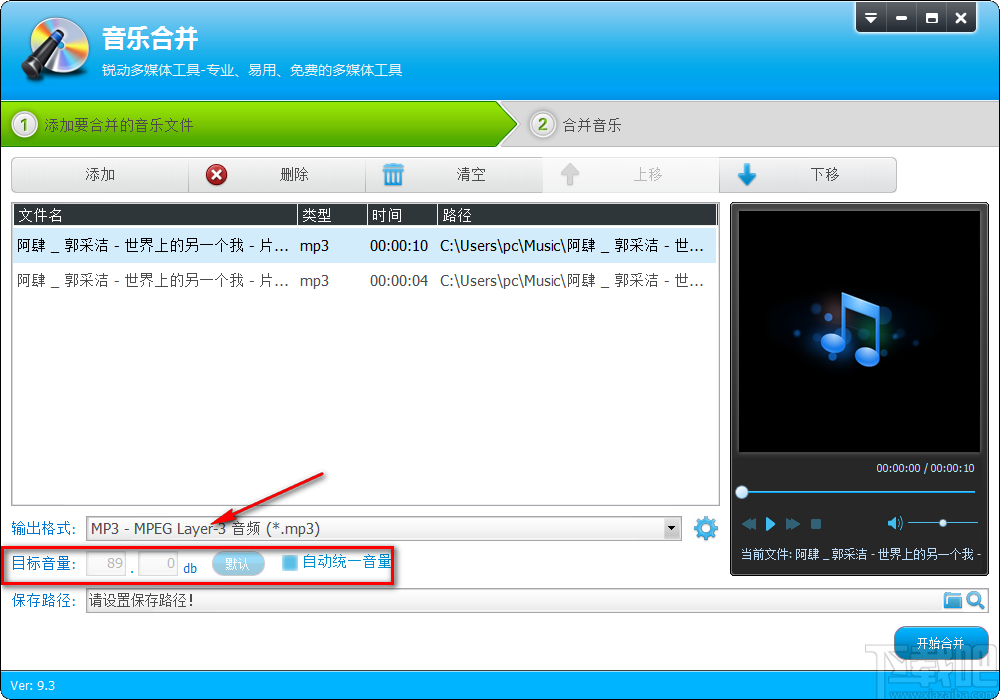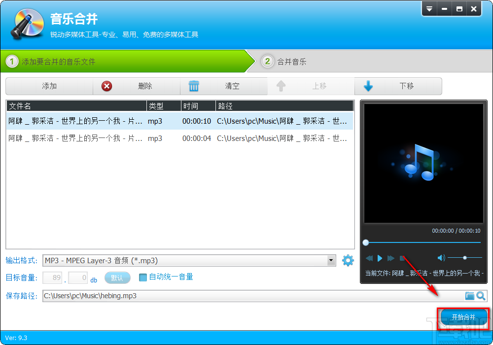 9.完成以上所有步骤后,我们在页面右下角找到蓝色的“开始合并”按钮,点击该按钮就可以合并音频并将其保存在指定的文件夹中。
