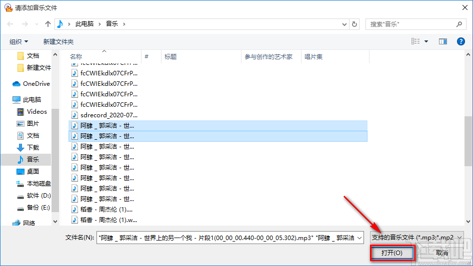 3.在文件添加页面中,我们找到需要合并的音频文件并选中,再点击页面右下角的“打开”按钮即可将文件添加到软件中。