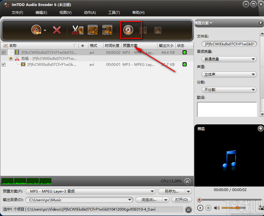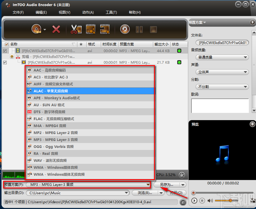 3.接着在界面左下方找到“预置方案”选项,点击该选项后面的下拉框,并根据自己的需要选择音频的输出格式。