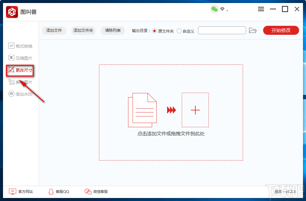 1.首先打开软件,在软件界面的左侧找到“更改尺寸”选项,点击该选项界面右侧就会出现相应的操作选择。