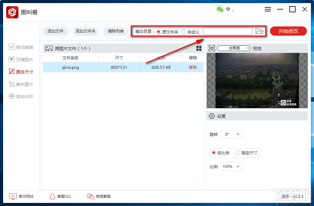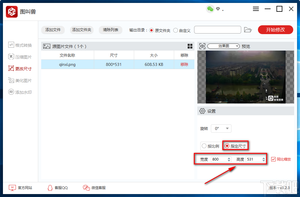 7.完成以上所有步骤后,我们在界面右上角找到红色的“开始修改”按钮,点击该按钮就可以开始更改图片尺寸并将其保存在指定的文件夹中。