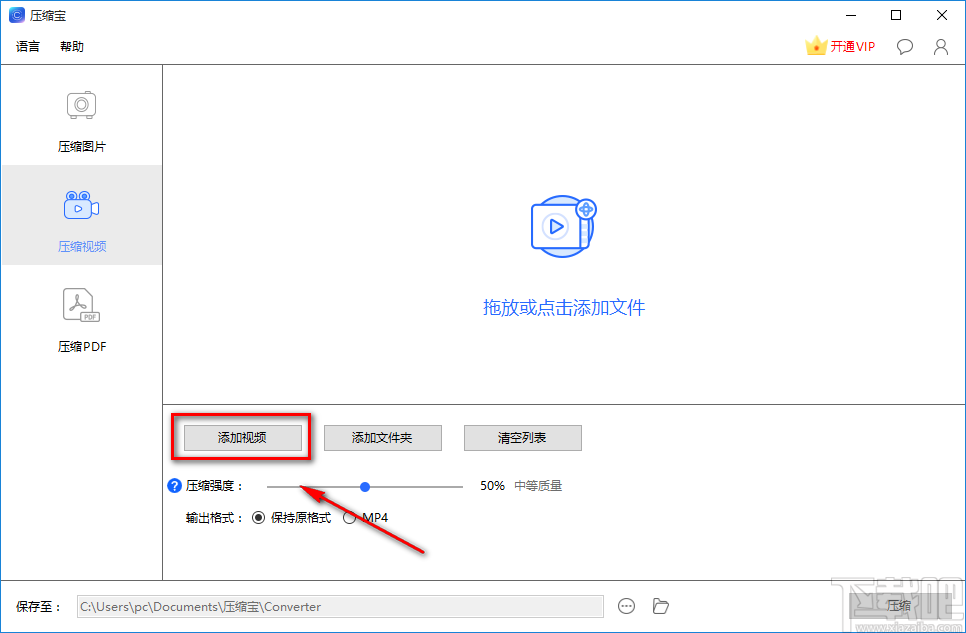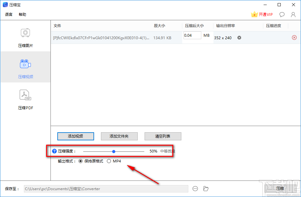 4.将视频文件添加到软件后,我们在界面左下角找到“压缩强度”选项,根据自己的需要,拖动其后方的小圆光标对压缩强度进行调整。