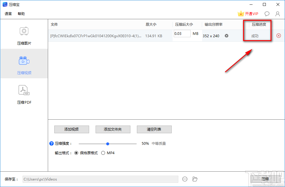 9.视频压缩的速度非常快,视频压缩完毕后,我们可以在界面上的文件列表中查看到压缩进度是成功状态。