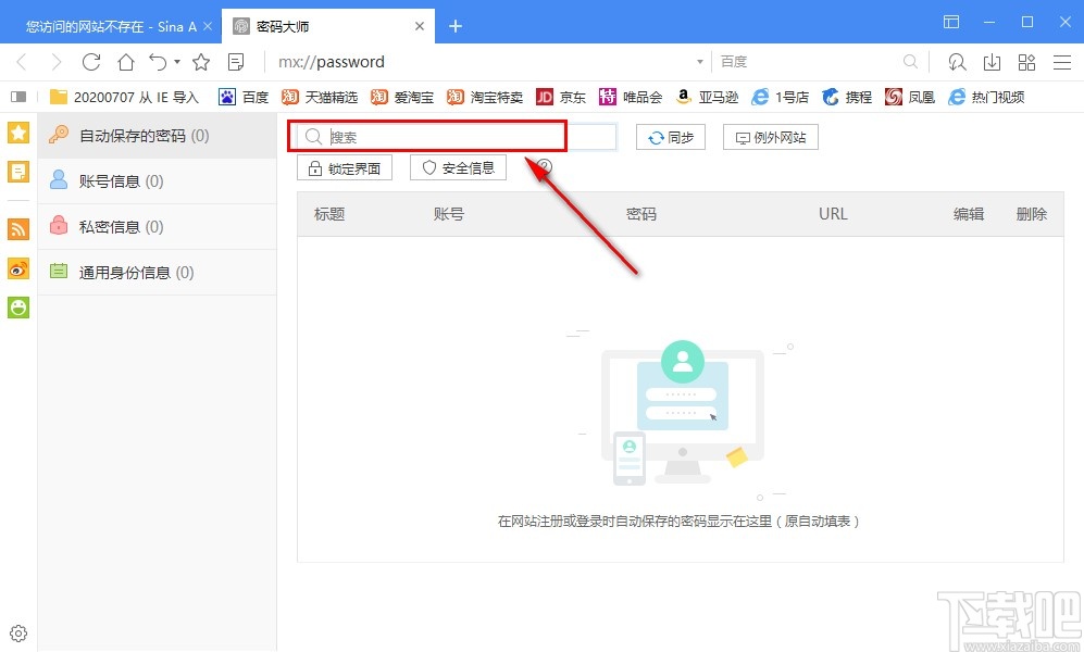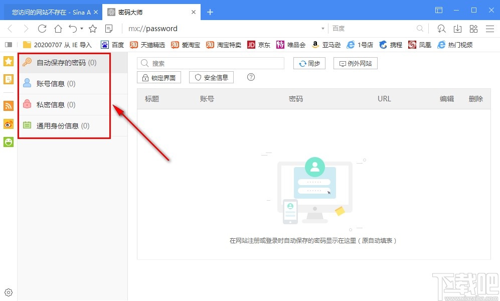 3.点击密码大师之后就会来到下图所示的界面了,我们在界面中可以看到自己在使用这款浏览器的时候保存的一些登录网站的账号密码信息,有自动保存的密码、账号信息等多种类型的密码信息。
