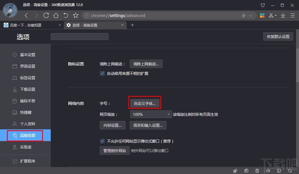 2.点击选择进入到浏览器的选项设置界面之后,我们点击左边的高级设置,然后就可以看到自定义字体按钮了,接着需要点击它。