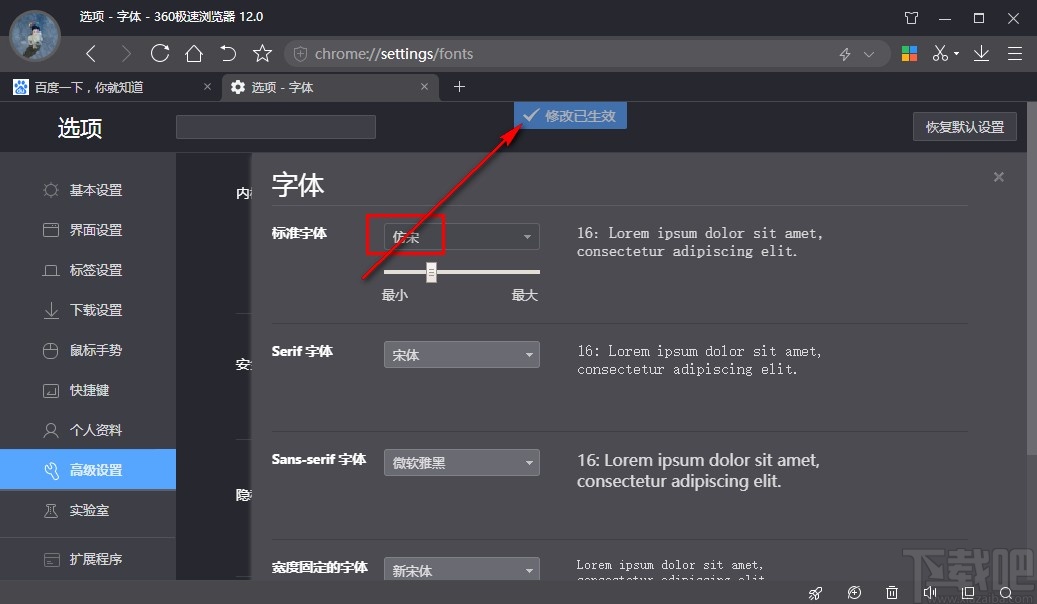使用上述教程中的操作方法我们就可以在360极速浏览器中设置字体了,有需要的朋友赶紧试一试这个方法吧,希望这篇教程能够帮助到大家。