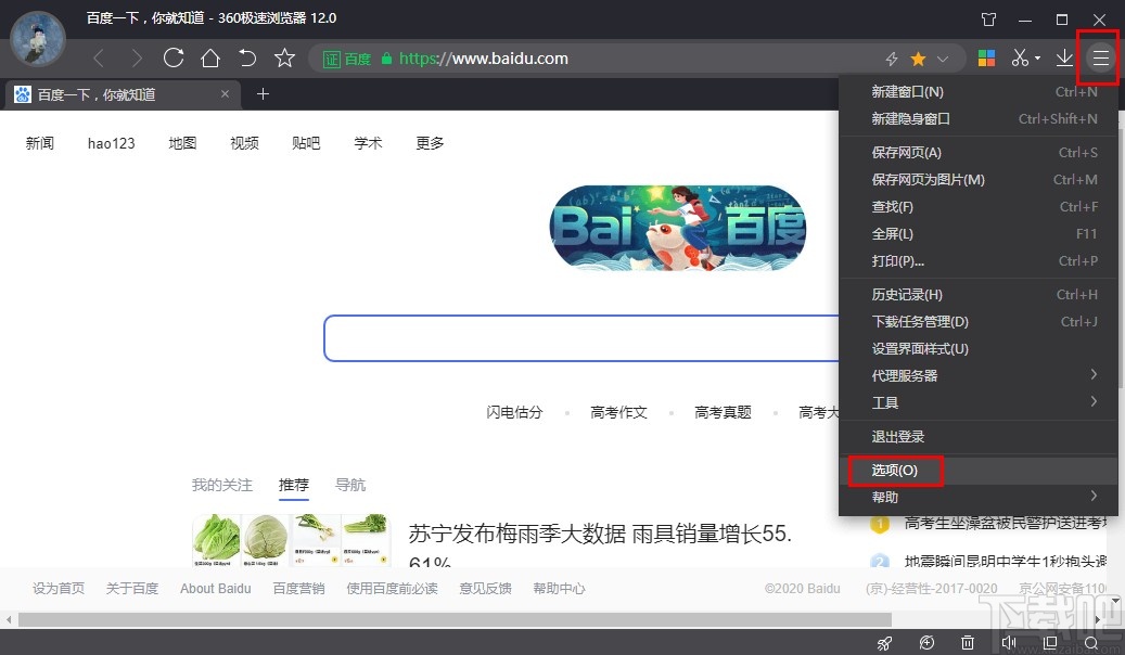 1.第一步我们打开浏览器界面之后,点击界面右上角的三条横线图标,然后在出现的选项中点击选择选项。