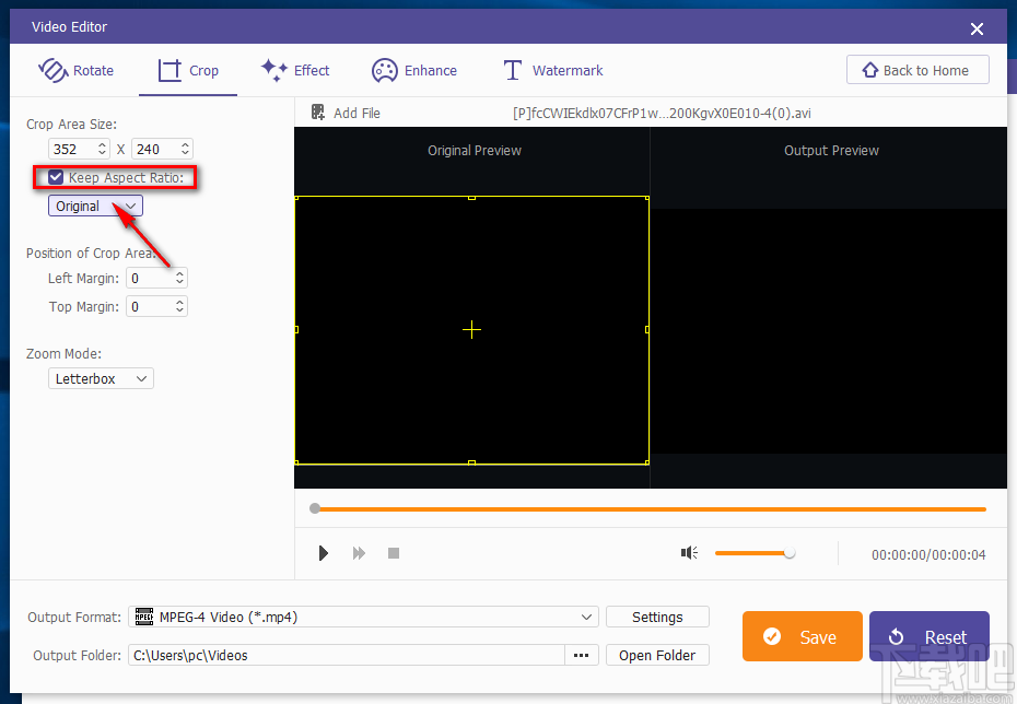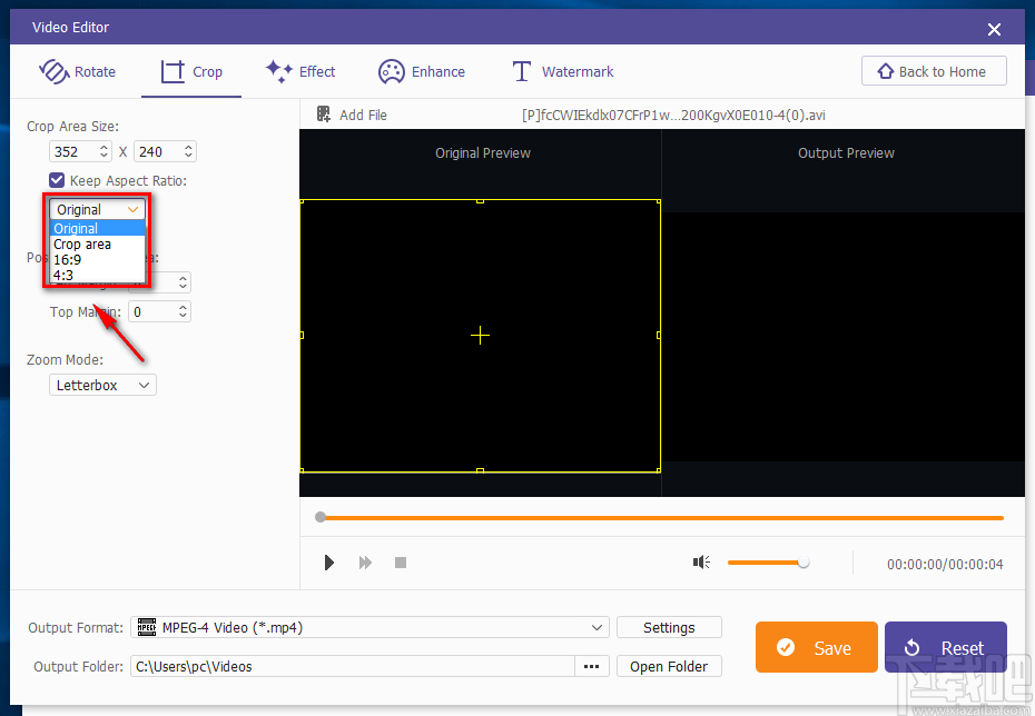 6.如果在第五步勾选了“Keep Aspect Ratio”选项,则还可以在页面左上方找到“Original”选项,点击该选项的下拉框,并根据自己的需要在下拉框中选择长宽比。