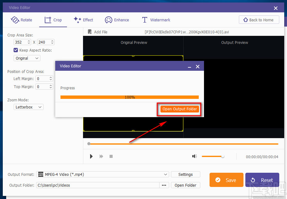12.裁剪视频画面的速度非常快,裁剪画面过程中,界面上会弹出一个进度框;任务完成后,我们可以在进度框中查看到进度是100%,还可以点击框中黄色的“Open Output Folder”按钮打开存放目录对文件进行查看。