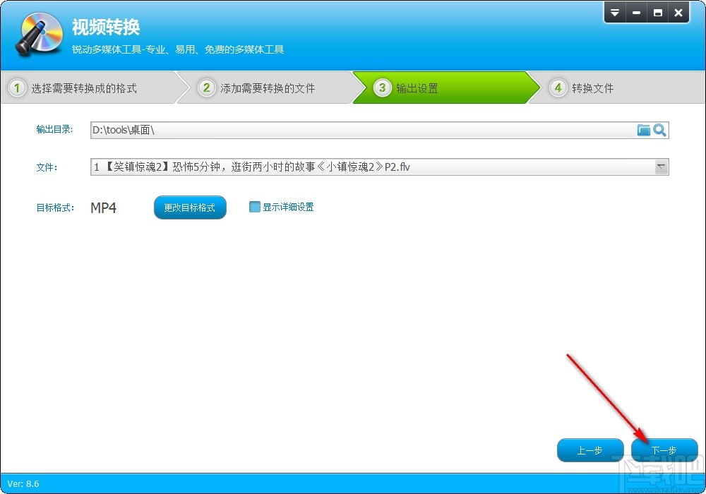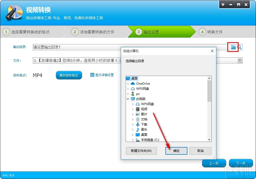 7.点击应用按钮之后回到转换视频界面点击下一步,就会来到输出设置界面了,我们点击输出目录右边的文件夹图标,选择想要保存的输出位置之后点击确定按钮。