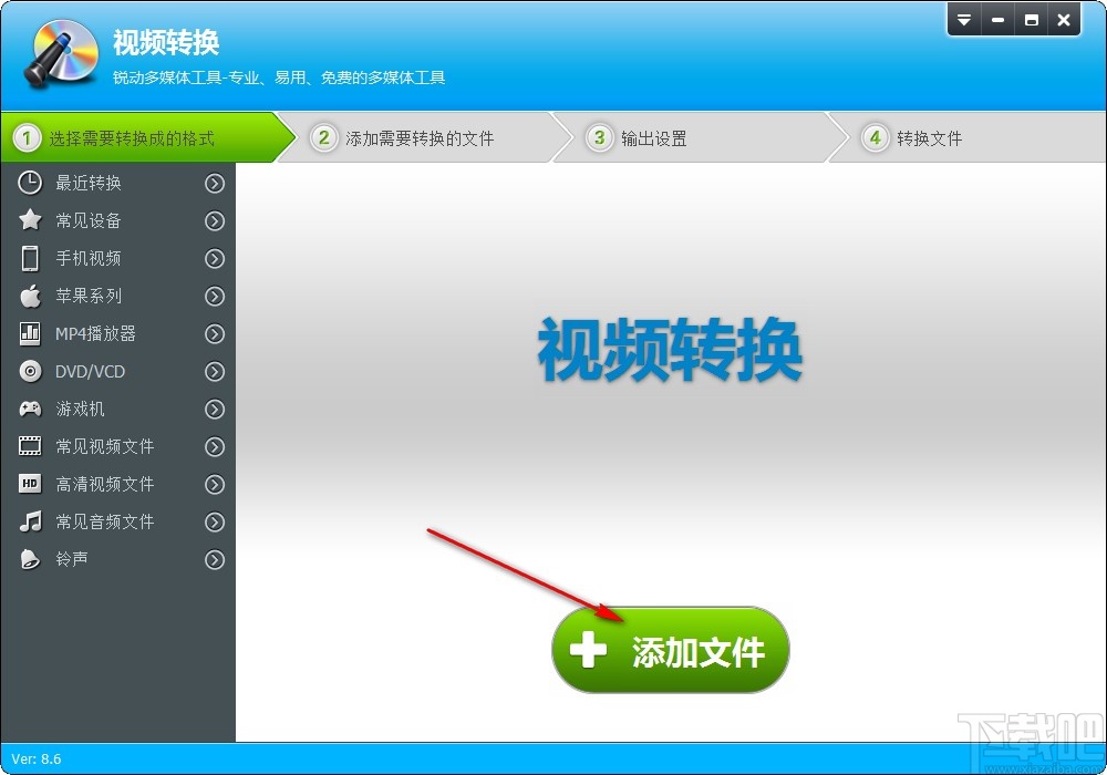2.进入到编辑与转换功能界面之后,我们点击绿色的添加文件按钮,点击之后准备添加想要处理的视频文件。