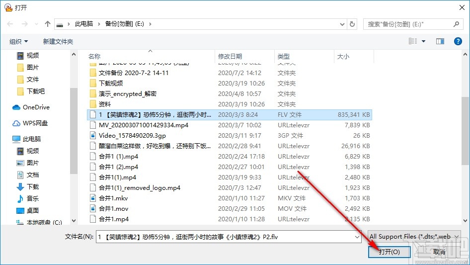 3.点击这个添加文件之后,下一步会打开一个选择文件的界面,我们选中目标视频文件之后,点击右下角的打开按钮。