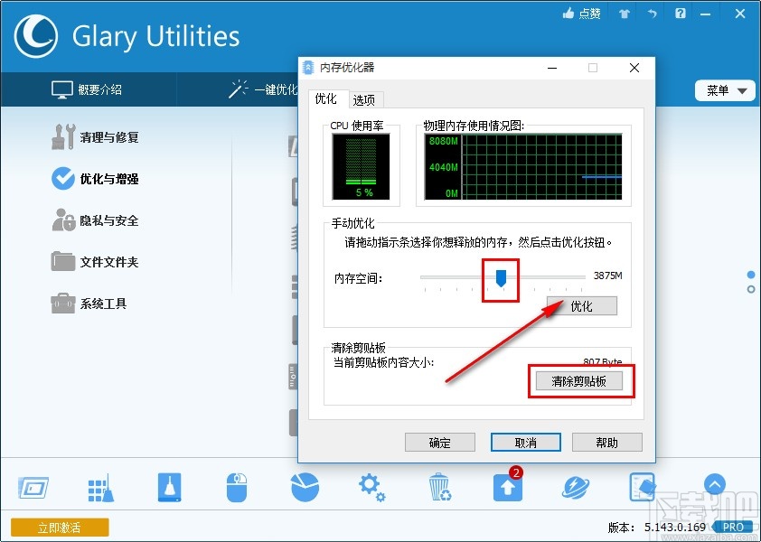 4.之后下一步我们可以在手动优化模块,点击滑块来选择想要释放的内容,并点击优化按钮即可,还可以点击清除剪贴板清除剪贴板内容。