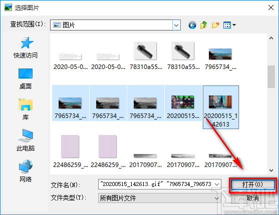 2.在文件添加页面中,我们按住Shift键,将需要添加水印的图片文件选中后,再点击页面右下角的“打开”按钮即可将文件添加到软件中。