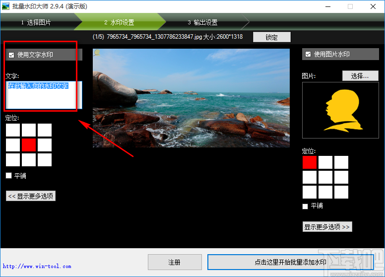4.在水印设置页面中,我们勾选左上角的“使用文字水印”选项,并在其下方的文本框中输入水印文字内容即可。