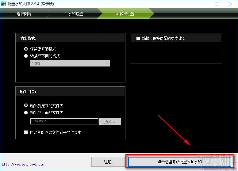 10.完成以上所有步骤后,我们在页面右下角找到“点击这里开始批量添加水印”按钮,点击该按钮就可以开始批量给图片添加水印了。