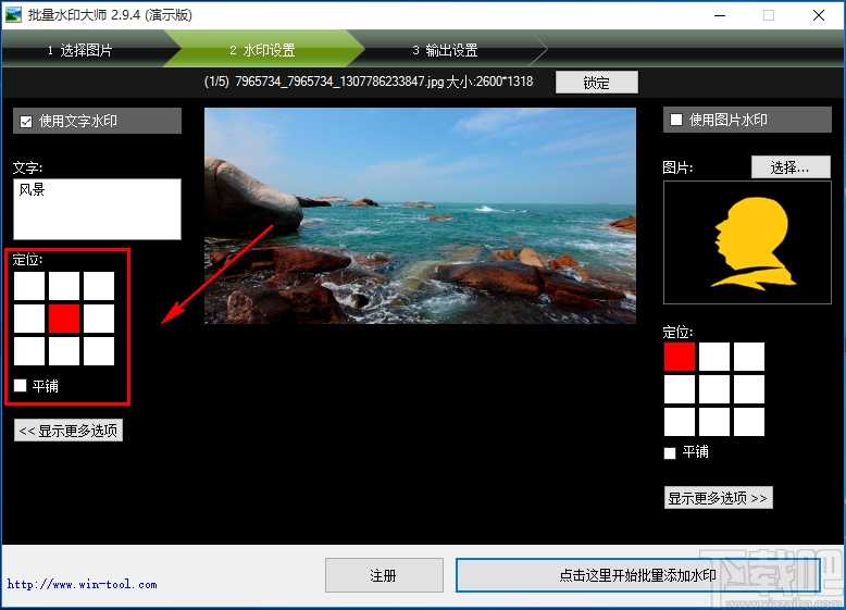 5.然后在界面左侧找到“定位”选项,我们根据自己的需要,在该选项下方对水印在图片中的位置进行调整,并自己决定是否勾选“平铺”选项。