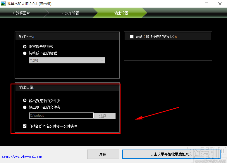 8.紧接着在页面左下方找到“输出目录”选项,同样根据自己的需要在选项下方对输出目录进行选择,小编选择“输出到原来的文件夹”;如果选择“输出到下面的文件夹”,则点击其右下方的“选择”按钮对输出目录进行选择。
