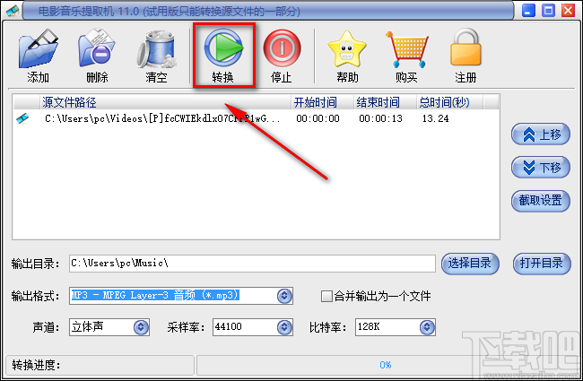 7.完成以上所有的步骤后,我们在界面顶部找到“转换”按钮,点击该按钮就可以开始音频文件的提取工作。