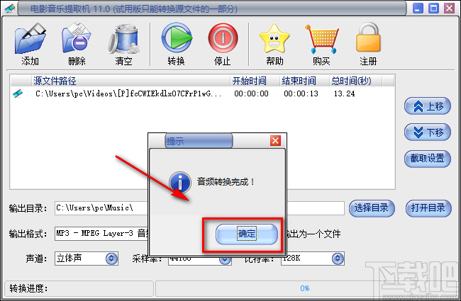 8.音频提取的速度非常快,音频提取完成后,界面上会弹出一个音频转换完成的提示框,我们点击框中的“确定”按钮可以打开文件的存放目录查看文件。