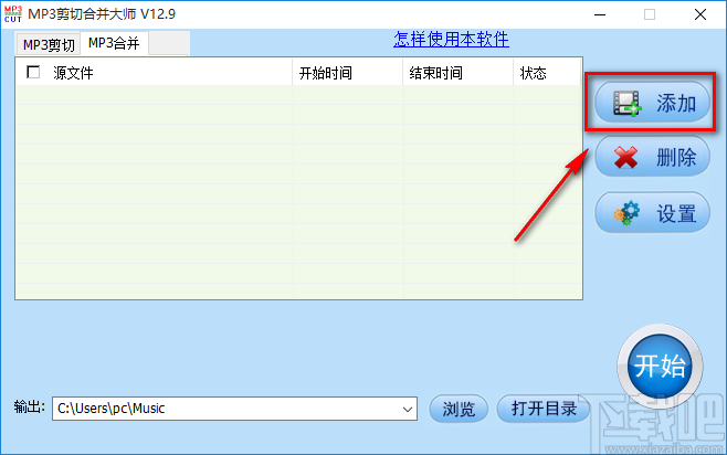 3.在MP3合并页面中,我们找到位于页面右侧的“添加”按钮,点击该按钮进入文件添加页面。