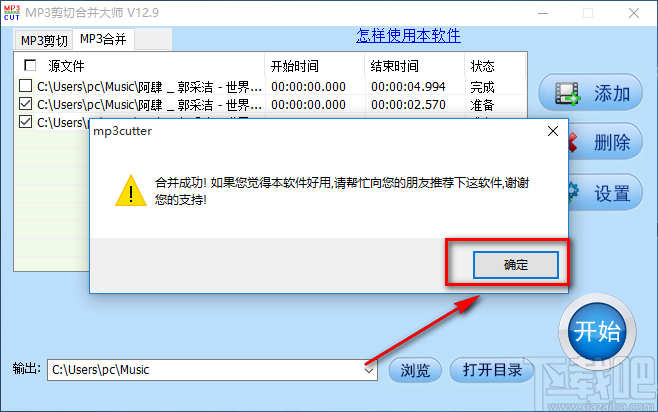 8.音频合并的速度非常快,音频文件合并完成后,界面上会弹出一个合并成功的提示框,我们点击框中的“确定”按钮可以打开文件的存放目录查看文件。