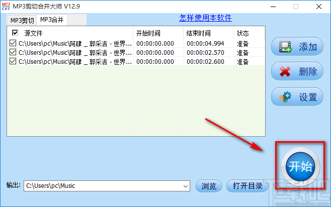 7.完成以上所有步骤后,我们在页面右下角找到蓝色的“开始”按钮,点击该按钮就可以开始音频文件的合并工作。