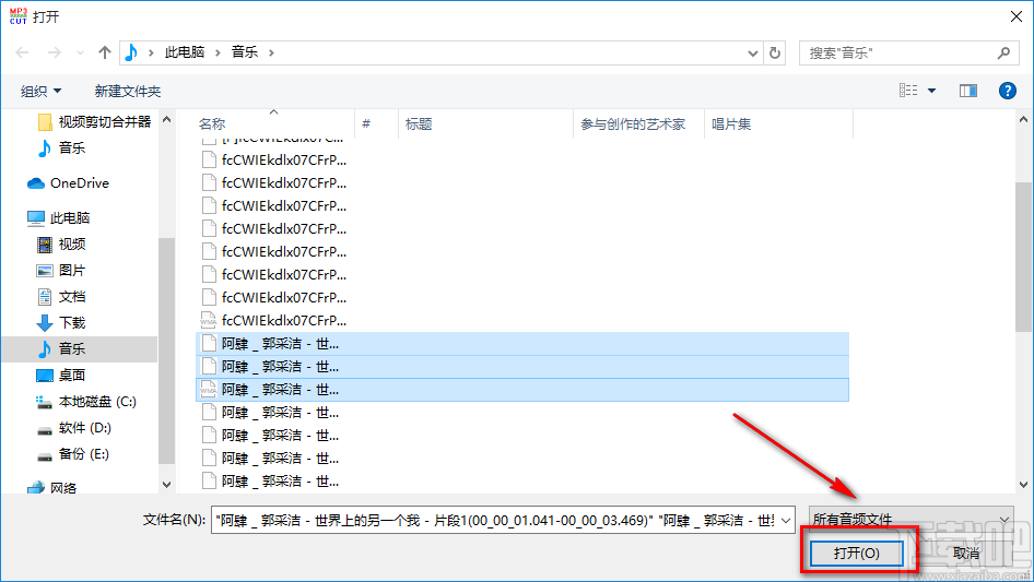 4.在文件添加页面中,我们找到需要合并的音频文件后,再点击页面右下角的“打开”按钮即可成功将文件添加到软件中。