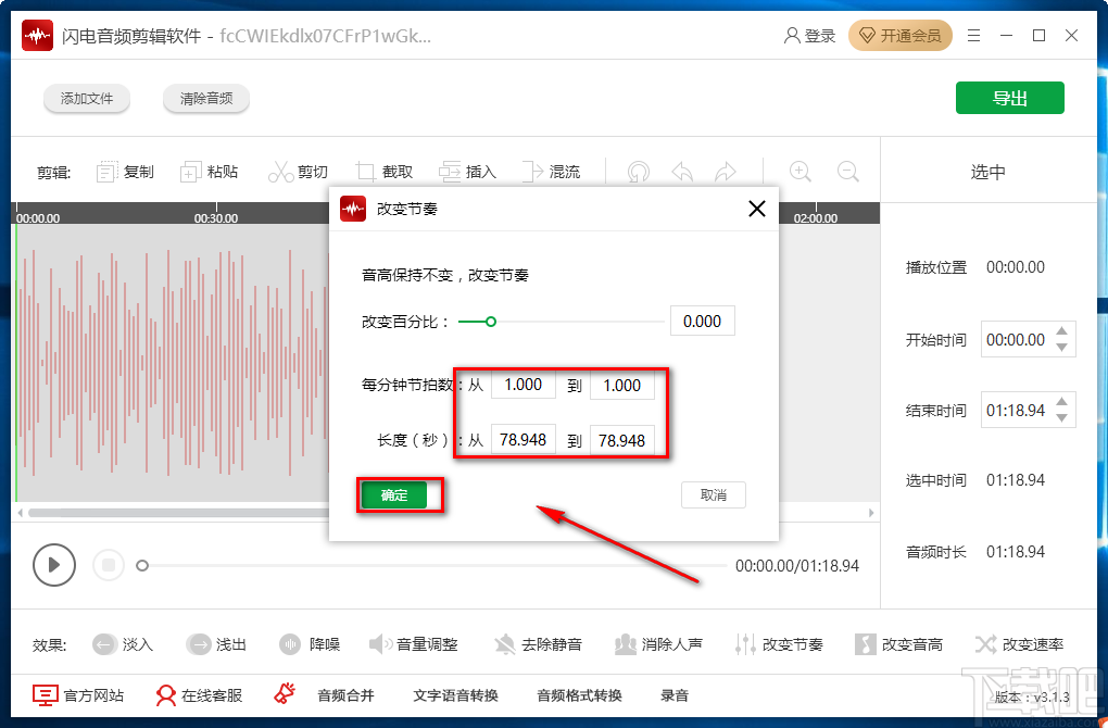 5.改变节奏框中还有“每分钟节拍数”和“长度(秒)”两个选项,这两个选项后面都有两个文本框,我们根据自己的需要在框中对这两个参数进行设置即可;然后再点击框中左下角绿色的“确定”按钮。
