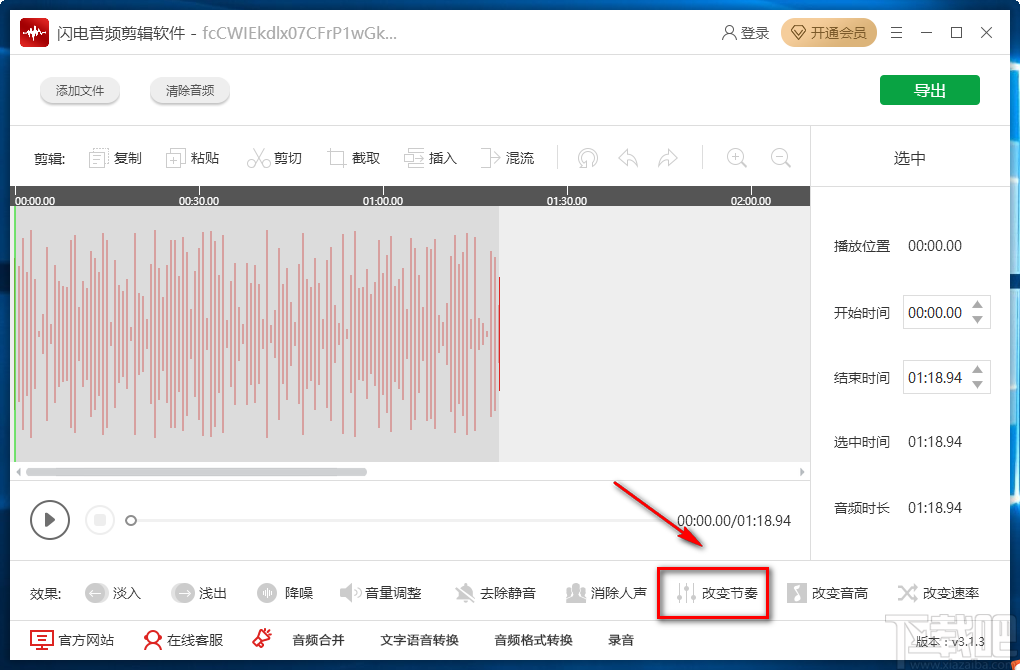 3.将文件添加到软件后,我们点击Ctrl+A键选中全部音频,再找到页面下方的“改变节奏”并点击,页面上会出现一个改变节奏框。