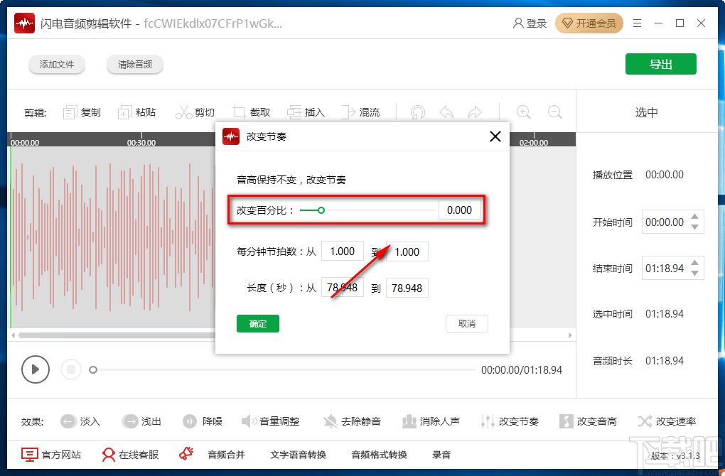 4.在框中找到“改变百分比”选项,该选项后面有一个小圆圈,我们可以拖动这个小圆圈来调整音频节奏。