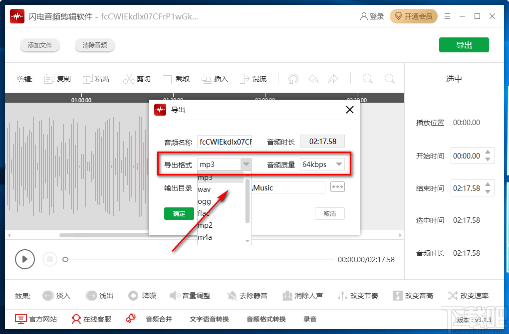 7.然后分别点击“导出格式”、“音频质量”下拉框,并根据自己的需要在下拉框中对这两个参数进行设置。