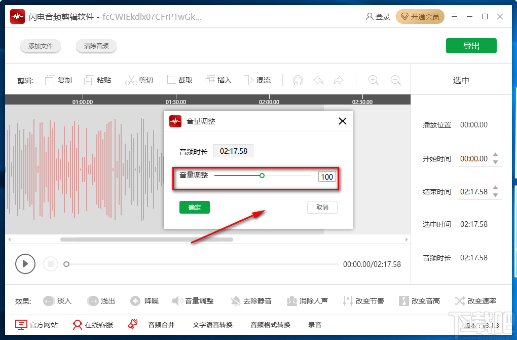 4.在音量调整框中找到“音量调整”选项,我们可以拖动该选项后面的小圆光标对音量进行调整;然后再点击框的绿色“确定”按钮即可回到软件界面上。