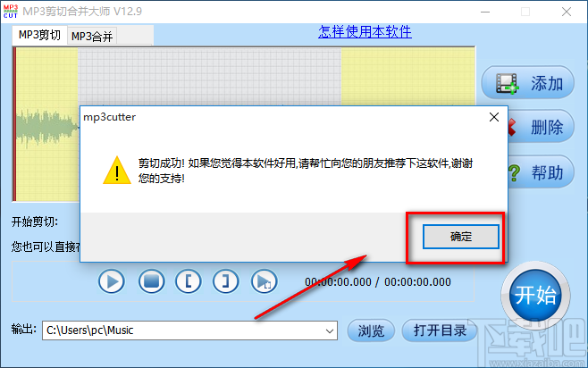 9.音频剪切的速度非常快,音频剪切完成后,界面上会弹出一个剪切完成的提示框,我们可以点击框中的“确定”按钮将文件存放目录打开并查看文件。