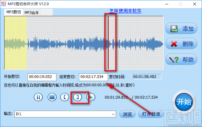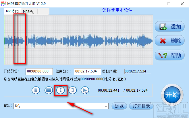 4.将文件添加到软件后,我们在音频试听框的左边可以看到一个红色竖向光标,向右移动该光标使其到音频剪切的起始位置,并点击页面下方的设置剪切起始点按钮。