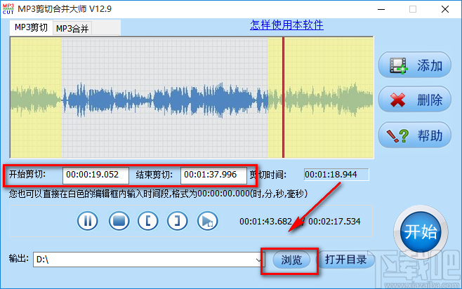 6.然后我们可以在界面试听框的下方查看到音频剪切的起始点和结束点;再点击页面右下方的“浏览”按钮即可进入到文件保存路径选择页面。