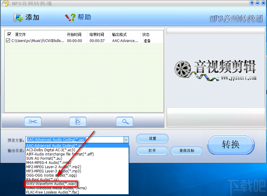 3.将文件添加到软件后,我们在界面左下方找到“预设方案”选项,点击该选项后面的下拉框,并在下拉框中选择WAV即可。