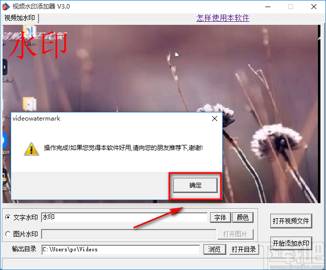 9.给视频添加水印的速度非常快,大约几秒钟的时间就可以完成;水印添加完成后,界面上会弹出一个操作完成的提示框,我们点击框中的“确定”按钮即可完成全部的操作步骤。