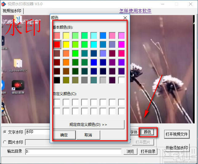 5.在字体按钮旁边还可以找到一个“颜色”按钮,我们点击该按钮,界面上会出现一个颜色设置窗口,在窗口中根据自己的需要对水印颜色设置成功后,再点击窗口左下方的“确定”按钮即可。